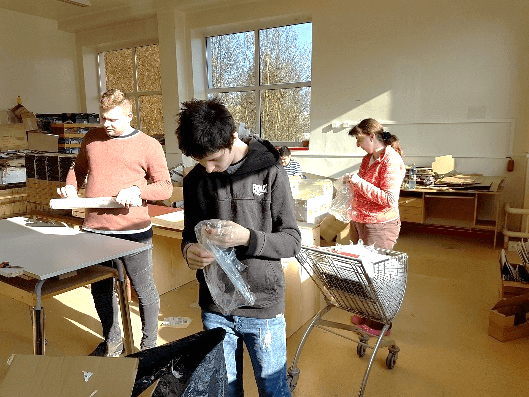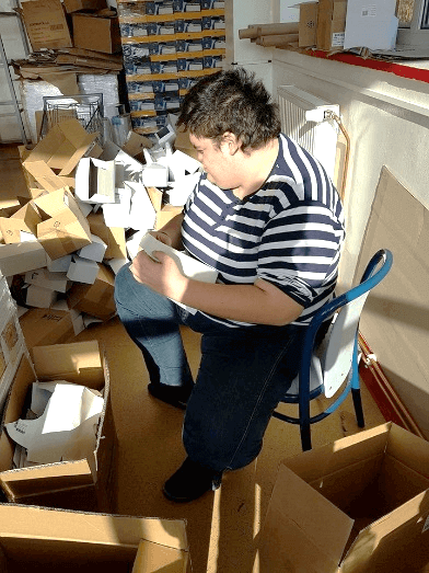 V dílně pracují čtyři lidé se zdravotním handicapem spolu s asistentem, který je pracovními činnostmi provází.
